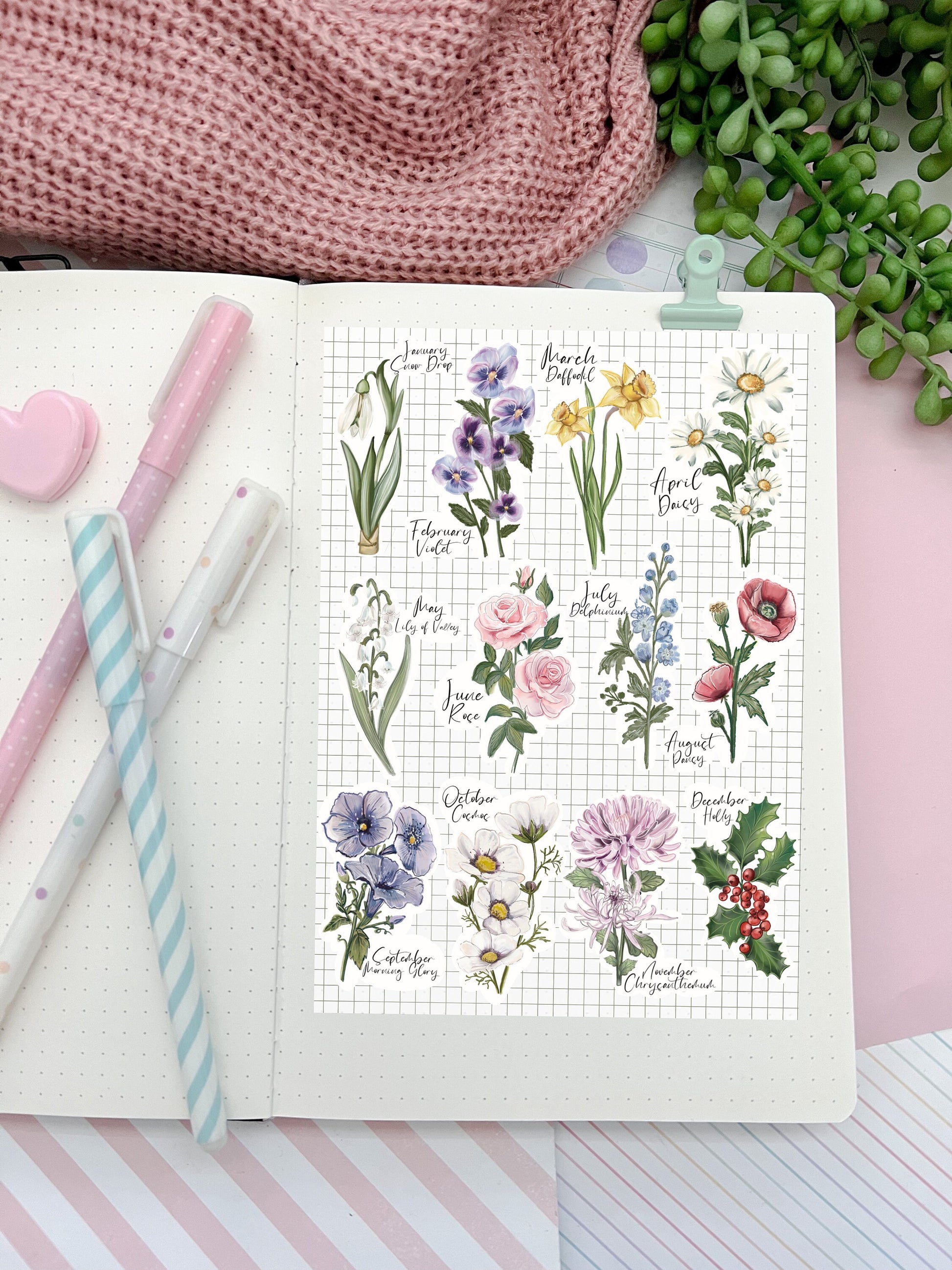 Birth month flower, floral aesthetic sticker sheet, book lover Stickers Illustration.