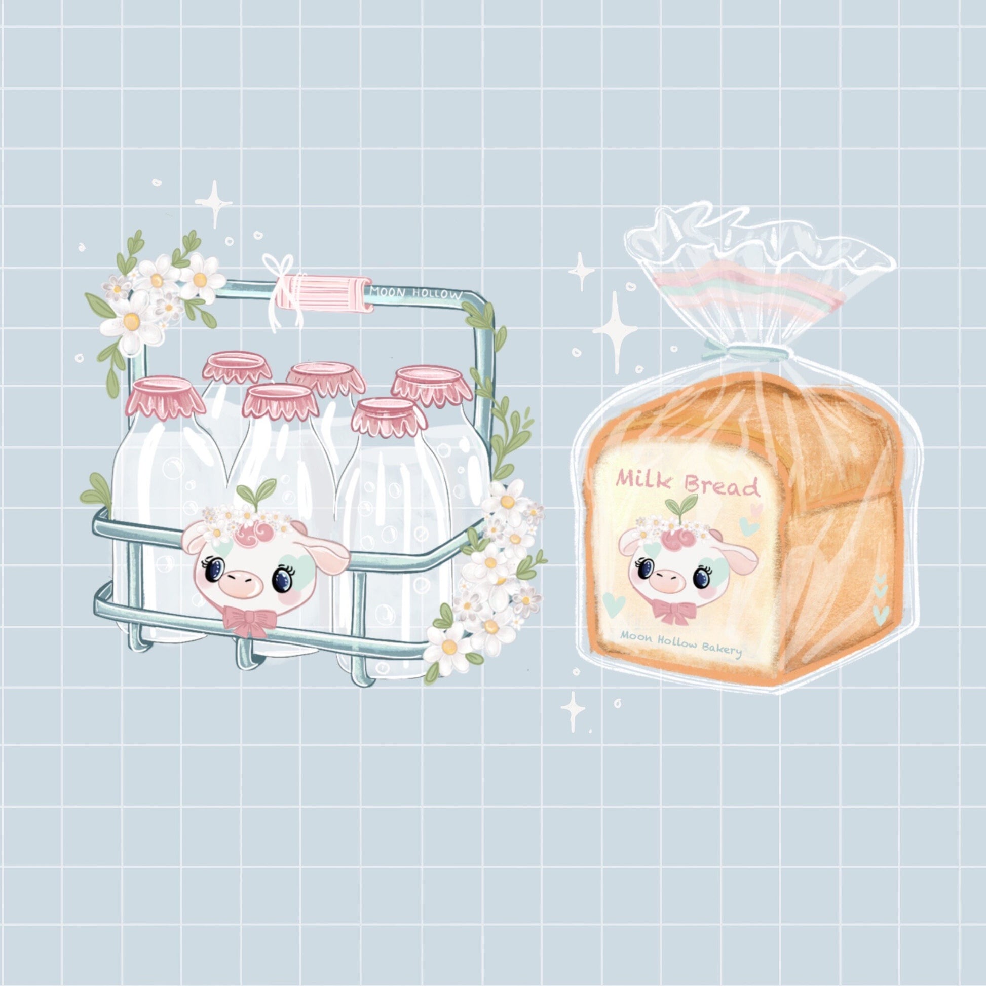 Kawaii bakery sticker pack, Cute cow, milk, bread. Japanese sandwich Digital Art, Stickers, Cute Illustration, space, Stationary, Hand drawn snacks, bujo bullet journal.