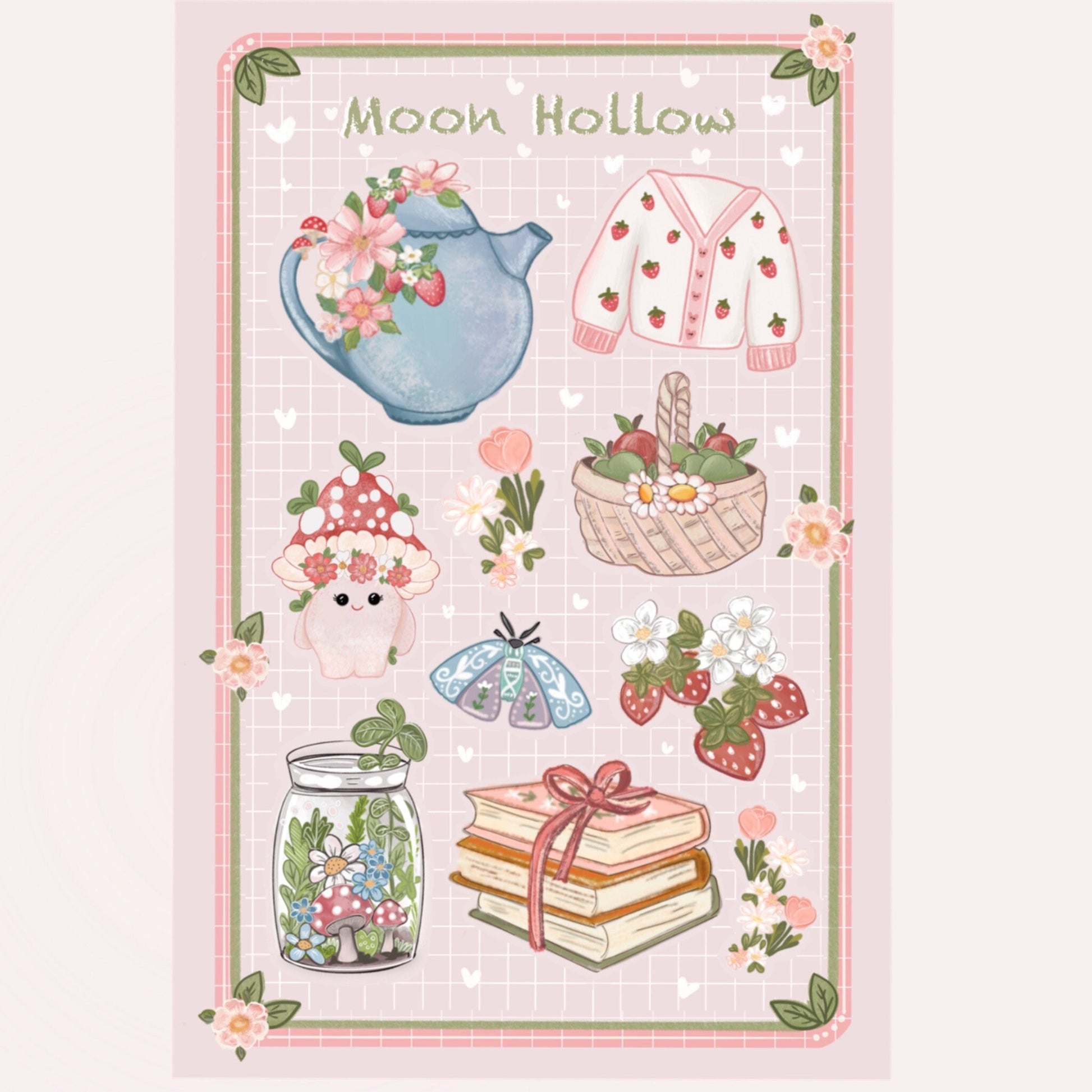 Sticker sheet - Strawberry booklover, cottagecore cozy bullet journal stickers. Reading stickers. Delicate stickers. Toadstool cozy journal.