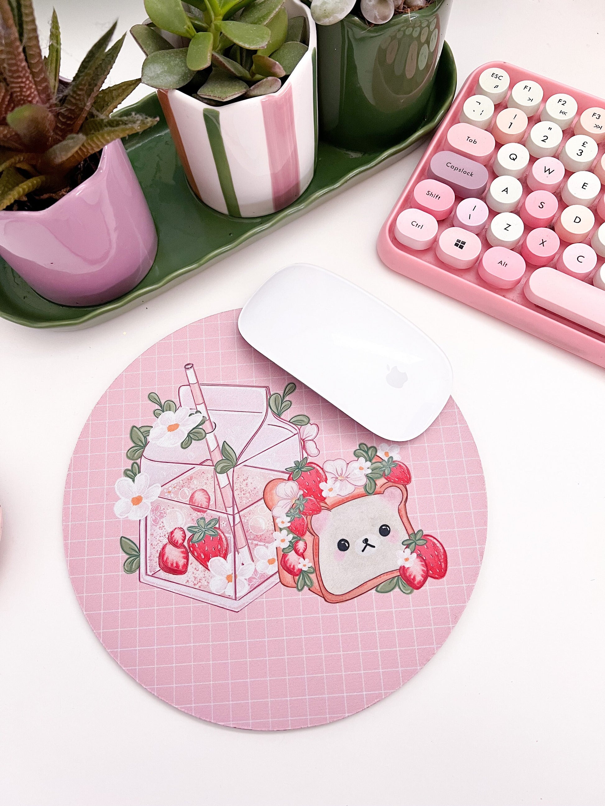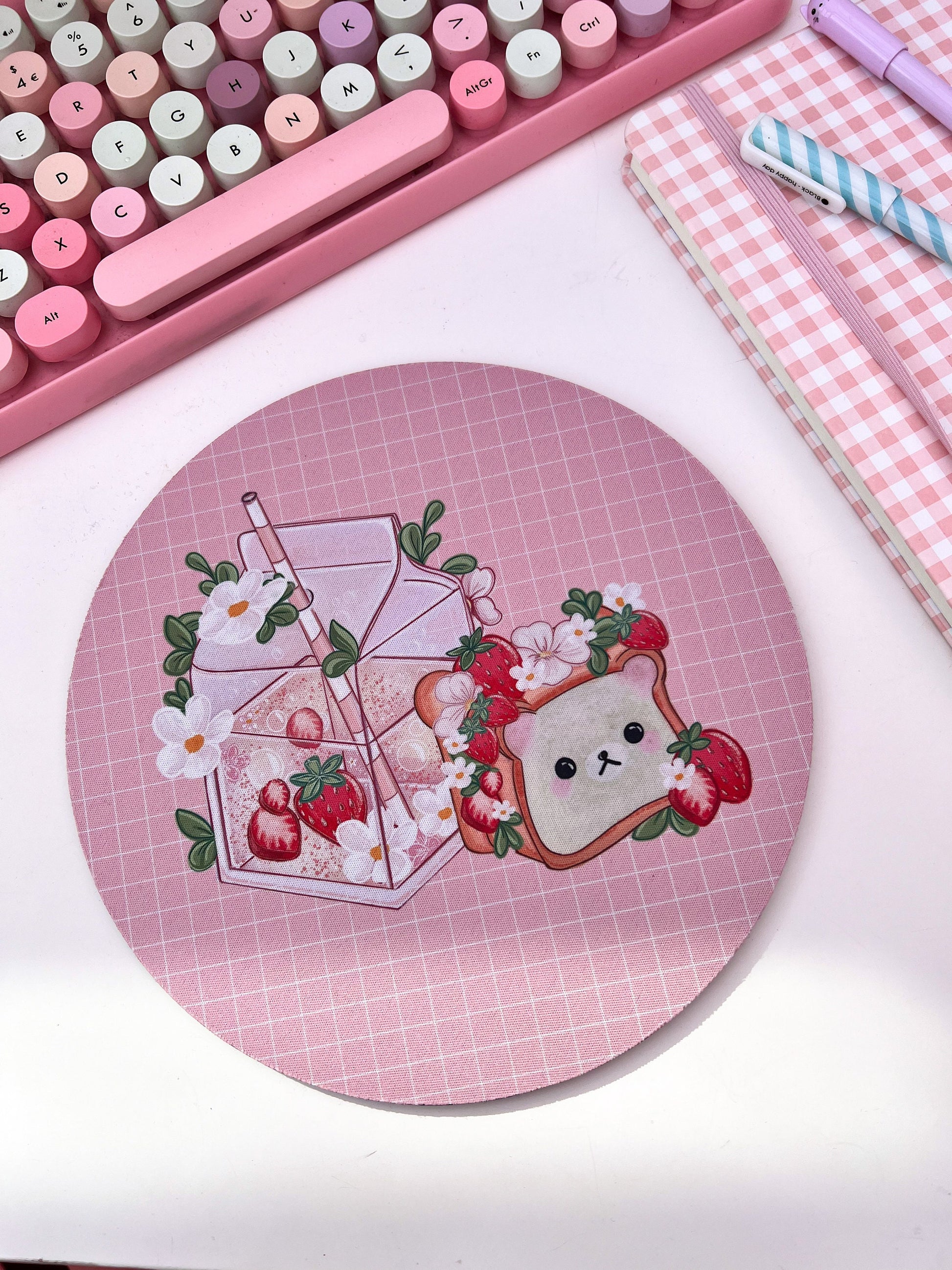 Strawberry bear mouse mat, mouse pad, kawaii computer mat. Gaming desk mat. Cute colourful desk setup mousepad.
